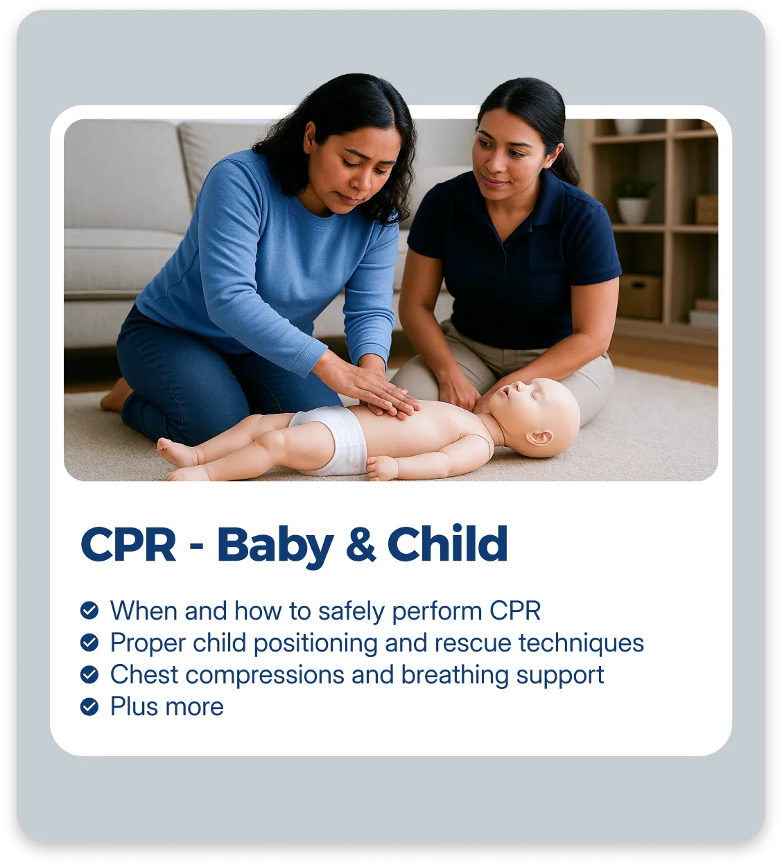 Our childcare safety course gives parents peace of mind, knowing everyone in the home is equipped with the same life-saving skills and ready to respond when it matters most.